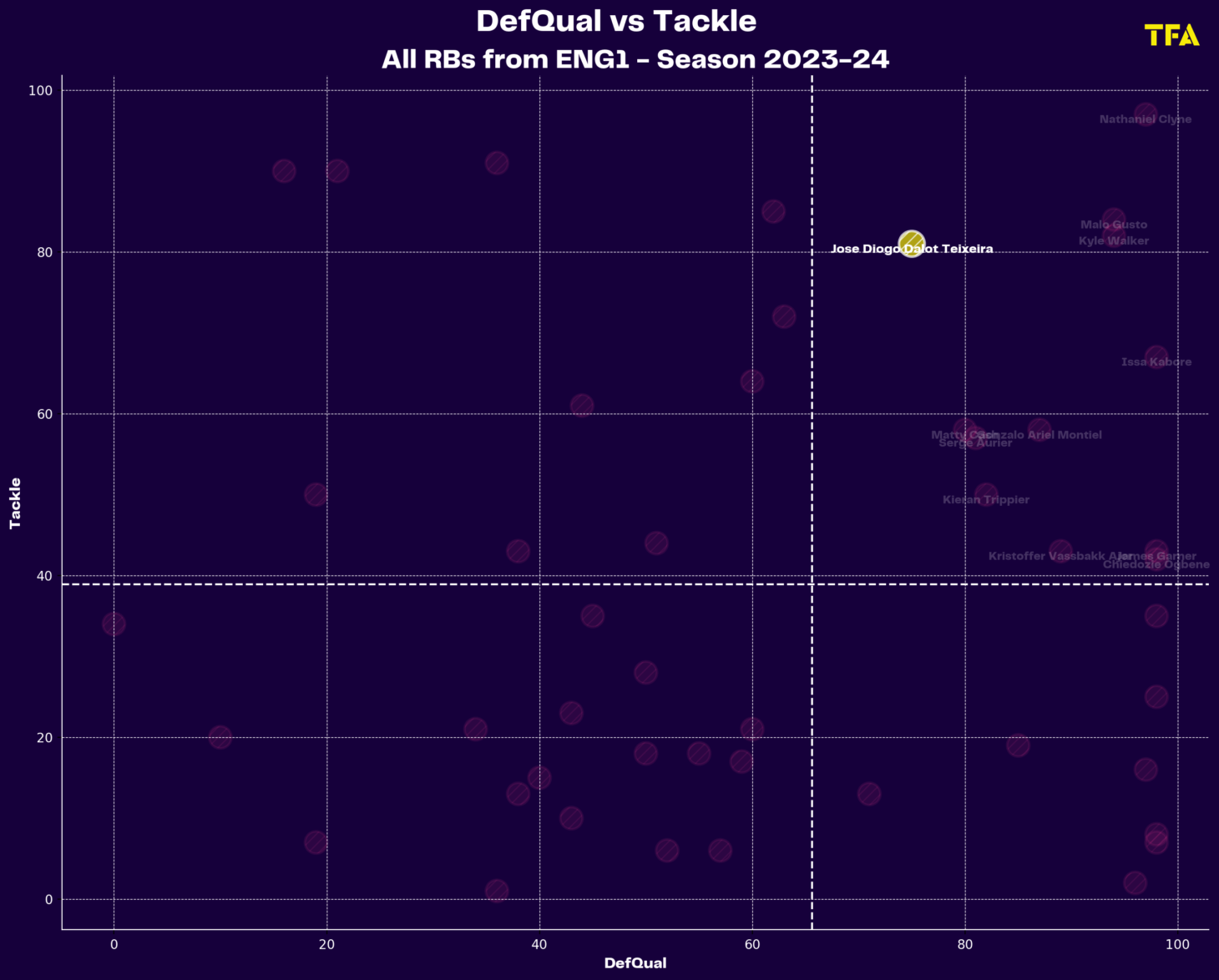 Diogo Dalot is not known for his defensive qualities and is more strong in moving the ball forward. This season things have been a little bit different. Dalot has won around 55% of his duels and has an interception rate of 4.09 per 90 minutes.