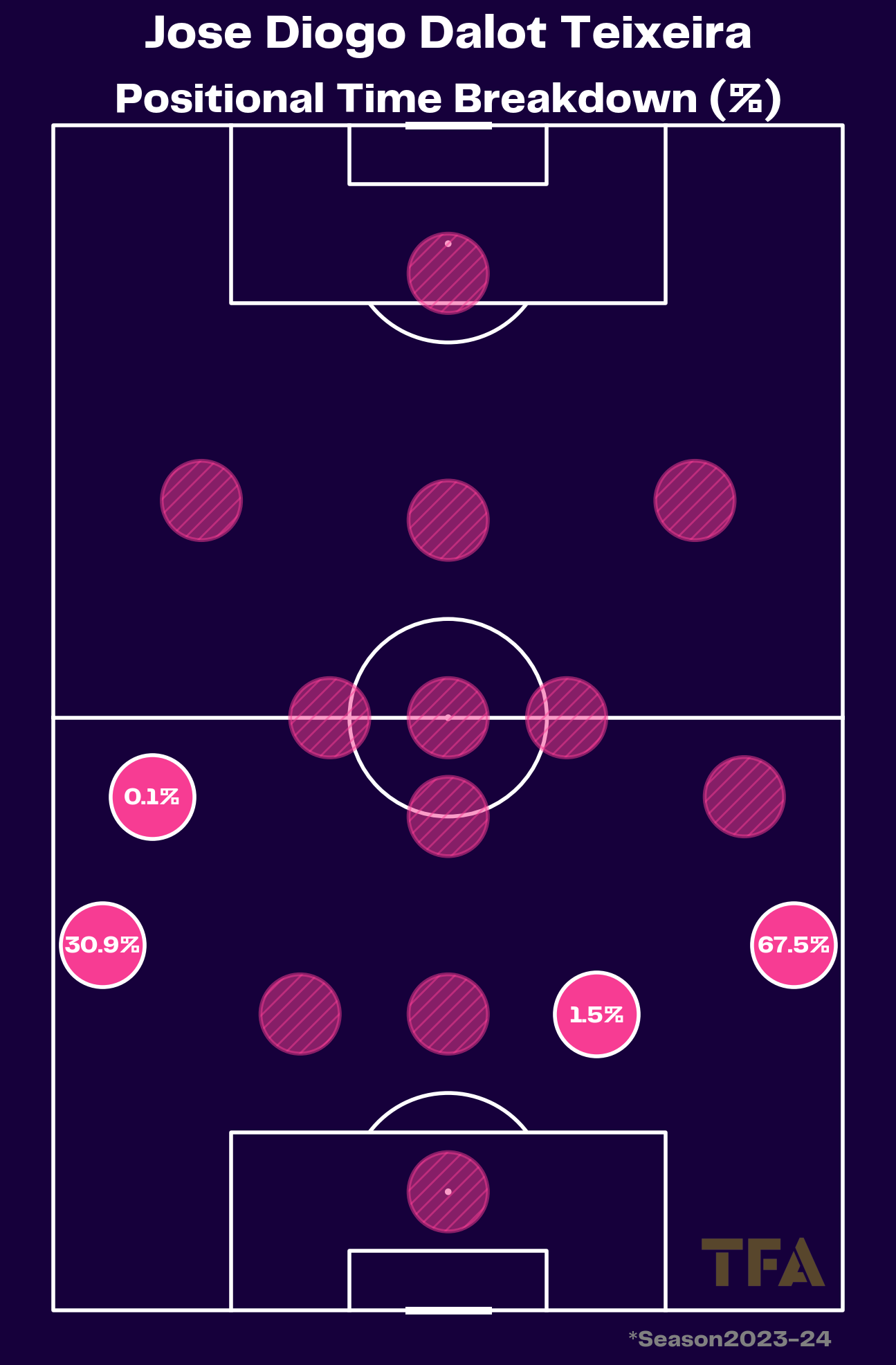 Diogo Dalot is a natural right-back who likes to make forward runs. Aaron Wan-Bissaka is playing on the right flank these days and Dalot has been shifted to the left side. The Portuguese has spent 31% of his minutes on the left in the English Premier League this season.