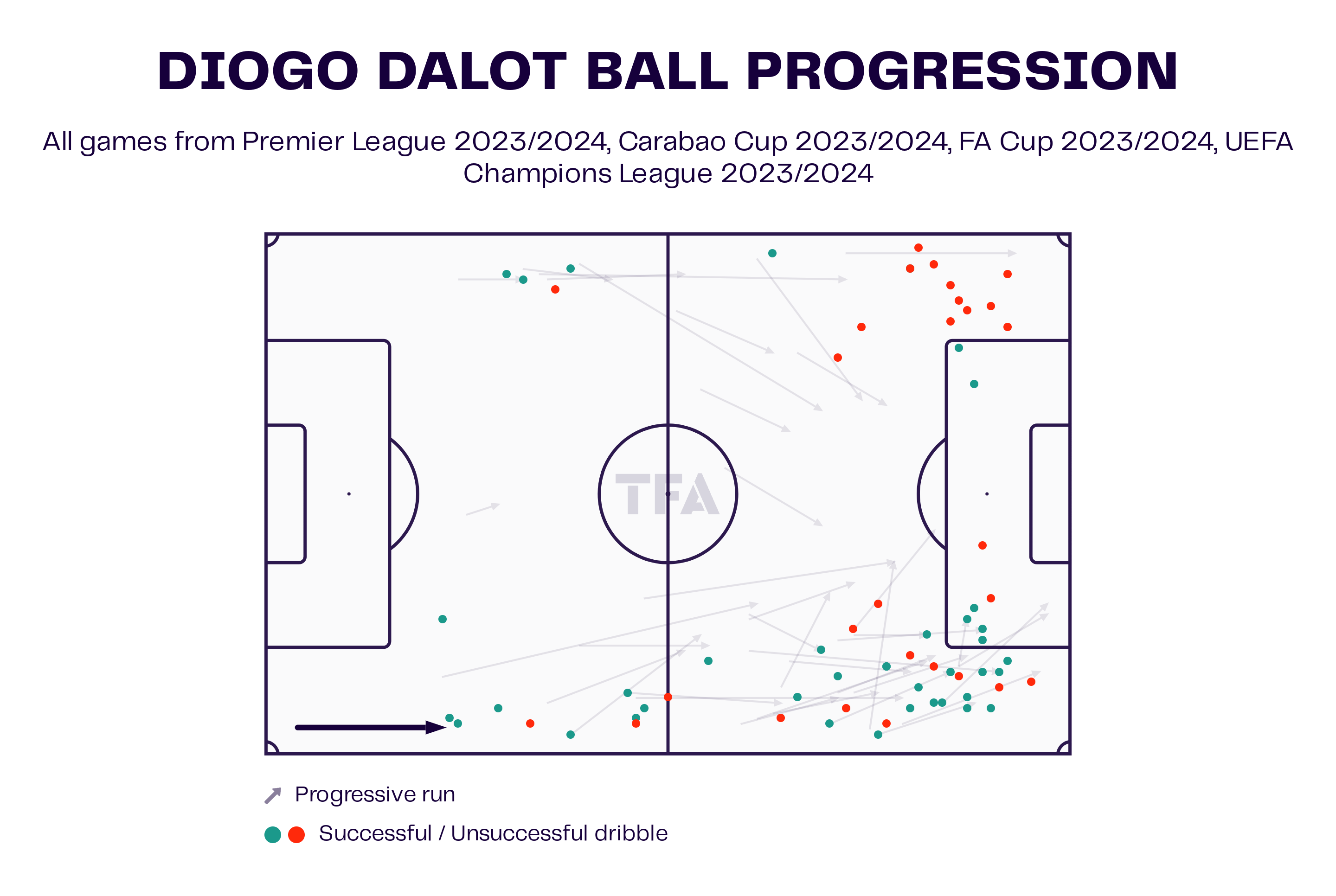 The 24-year-old likes to make attacking runs and has been pretty effective in doing this throughout the season. Dalot has averaged 1.4 progressive runs per 90 minutes and enjoyed a 58.2% dribble success rate. In the 2023-24 season, the full-back has made more successful runs down the right flank. Dalot has struggled to dribble past defenders on the left side.