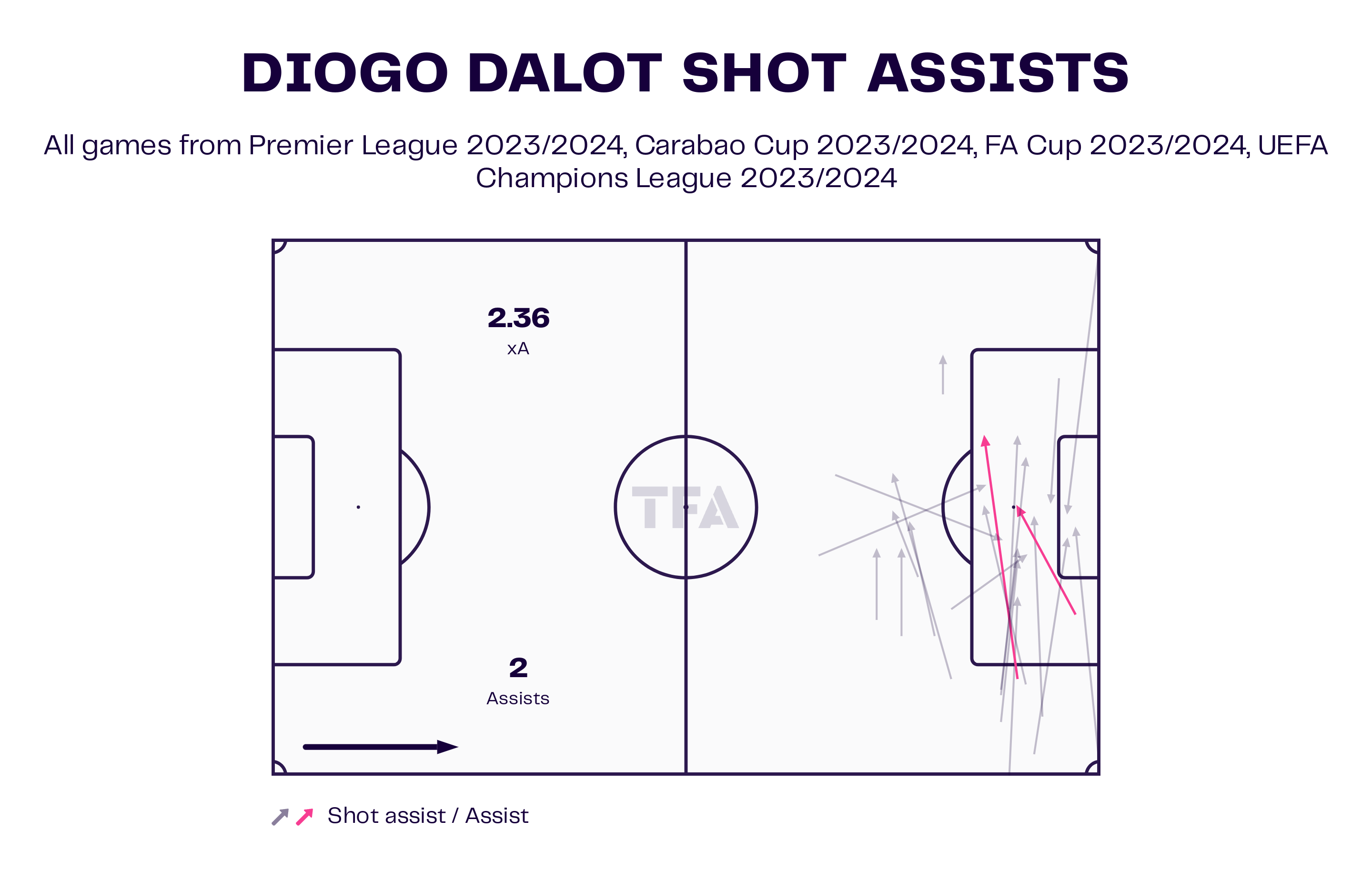 In the 2023-24 season, Dalot has two goals and two assists to his name. Most of his shot assists have landed in dangerous scoring areas.