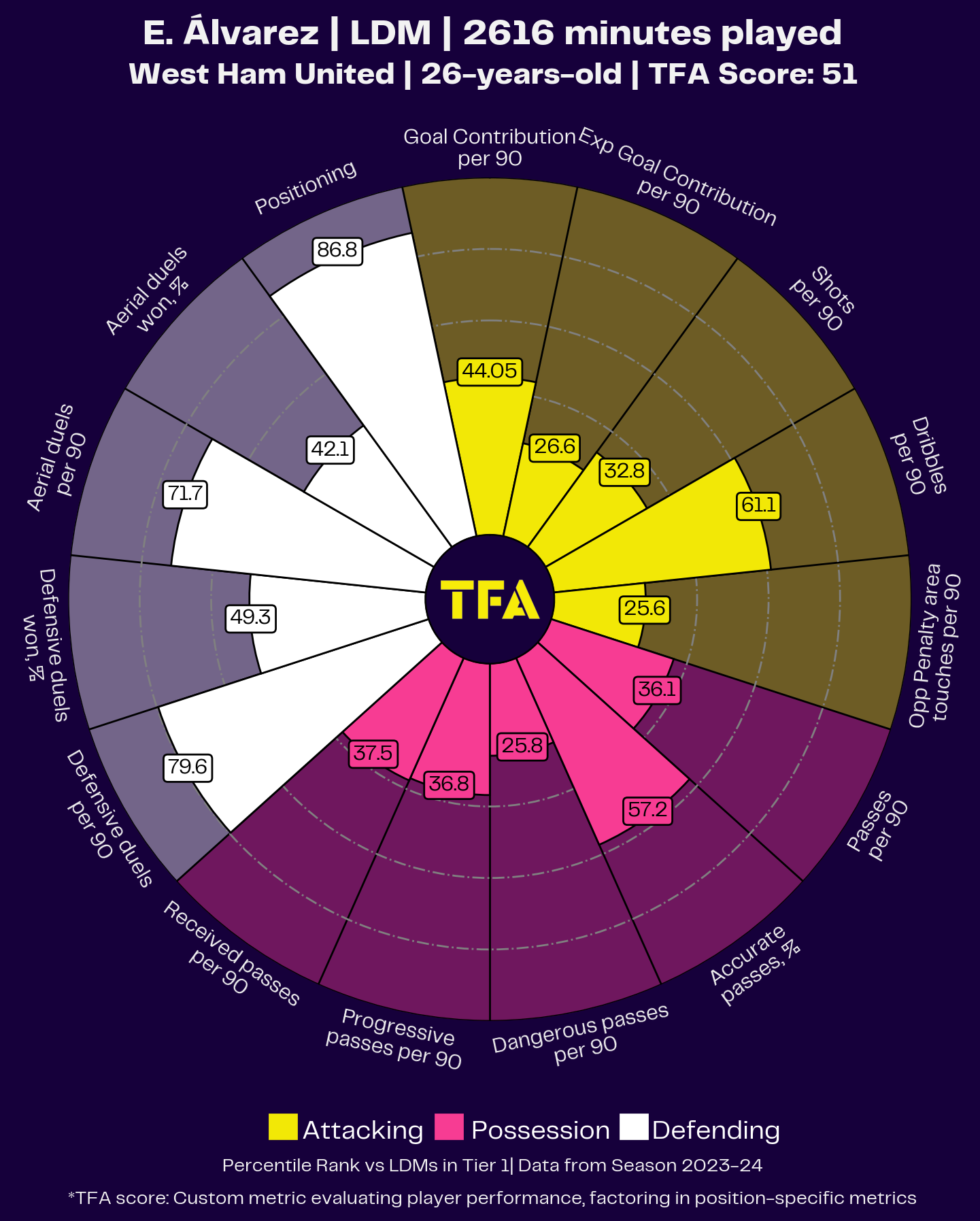 The above viz shows the percentile rank of the player in comparison to other left-defensive midfielders in Tier 1 of league football. Alvarez is ranked among the best for his defensive work. His positioning and duels winning ability make him one of the best in the business. Overall, Alvarez had a pretty decent season in English football.