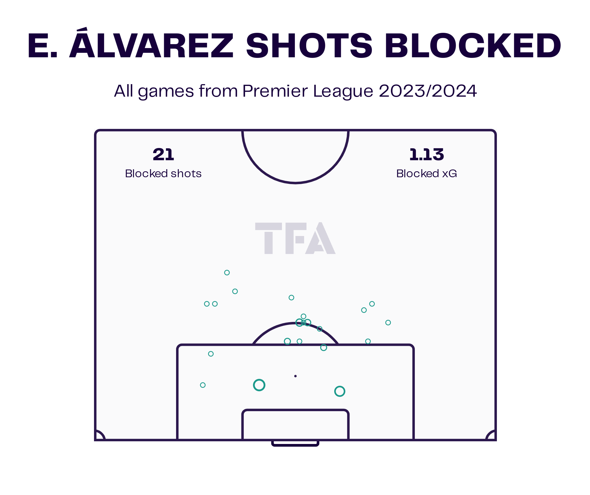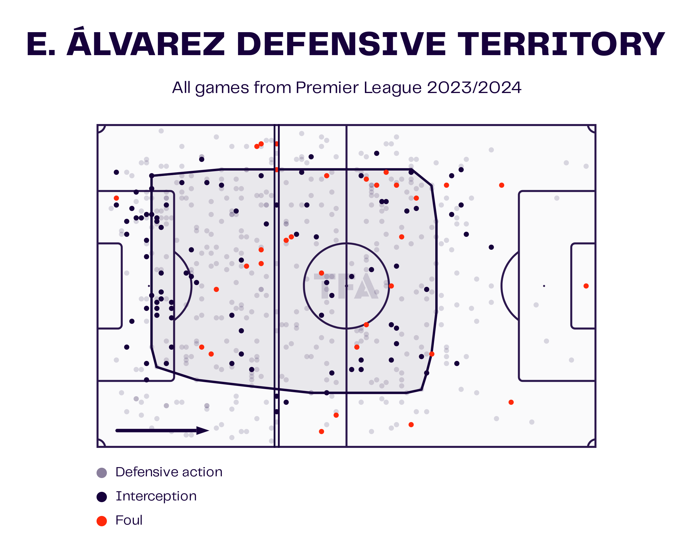 Edson sits in front of the defence for the Hammers. The 26-year-old midfielder is known for his defensive contributions to the team. By looking at the above viz we can observe that Alvarez covered a lot of areas on the field. He made a few errors by giving away fouls and even a penalty. West Ham struggled to find their rhythm following Rice’s departure. However, Edson managed to make interceptions in crucial areas to stop the opposition.