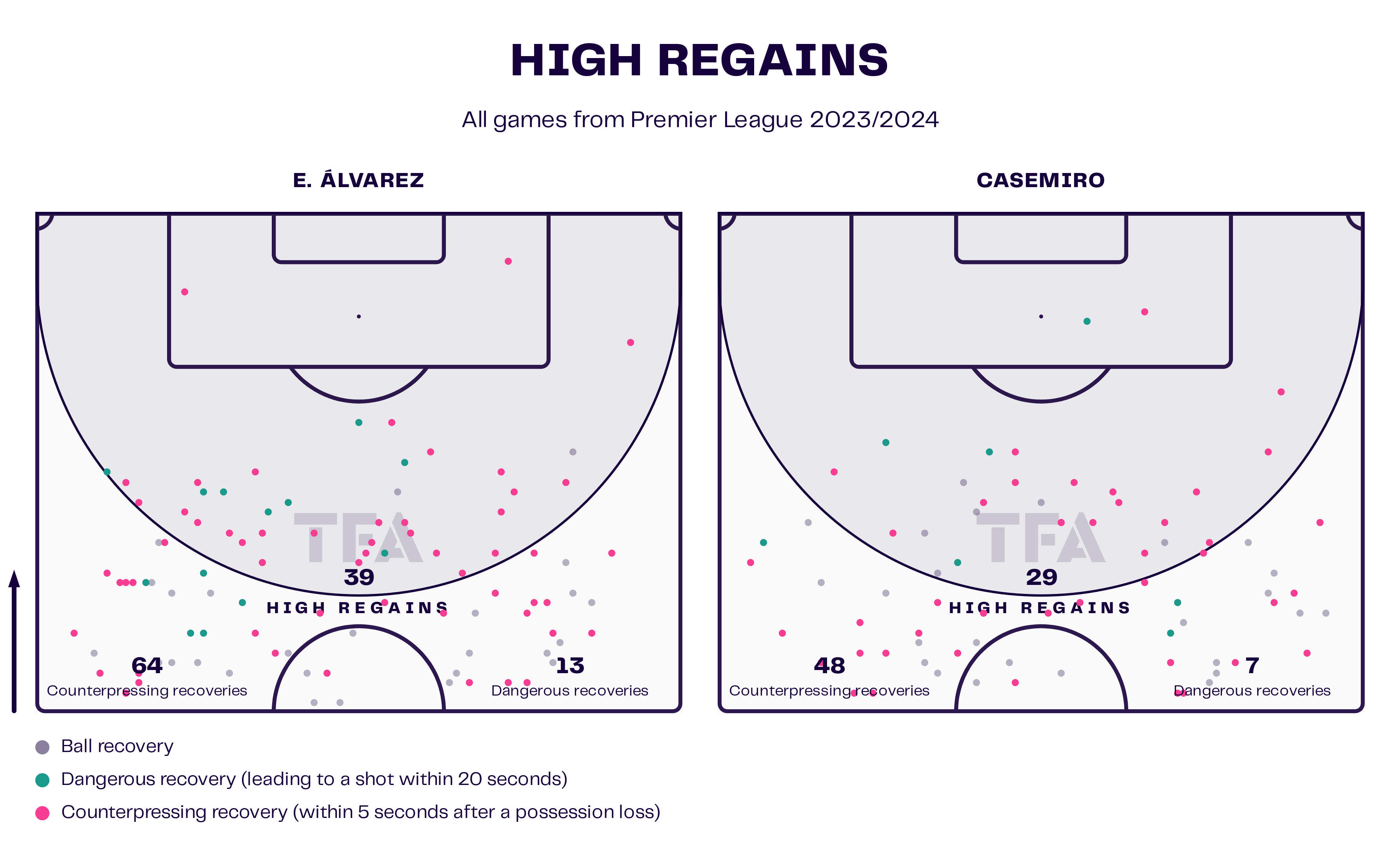 One area where Alvarez proved crucial for the Hammers was in recovering the ball high up on the field. Edson was involved in counter-pressing as well as dangerous recoveries. When compared with Casemiro, the Mexican midfielder made more recoveries in the attacking areas. Some dangerous recoveries even came on the edge of the penalty box.