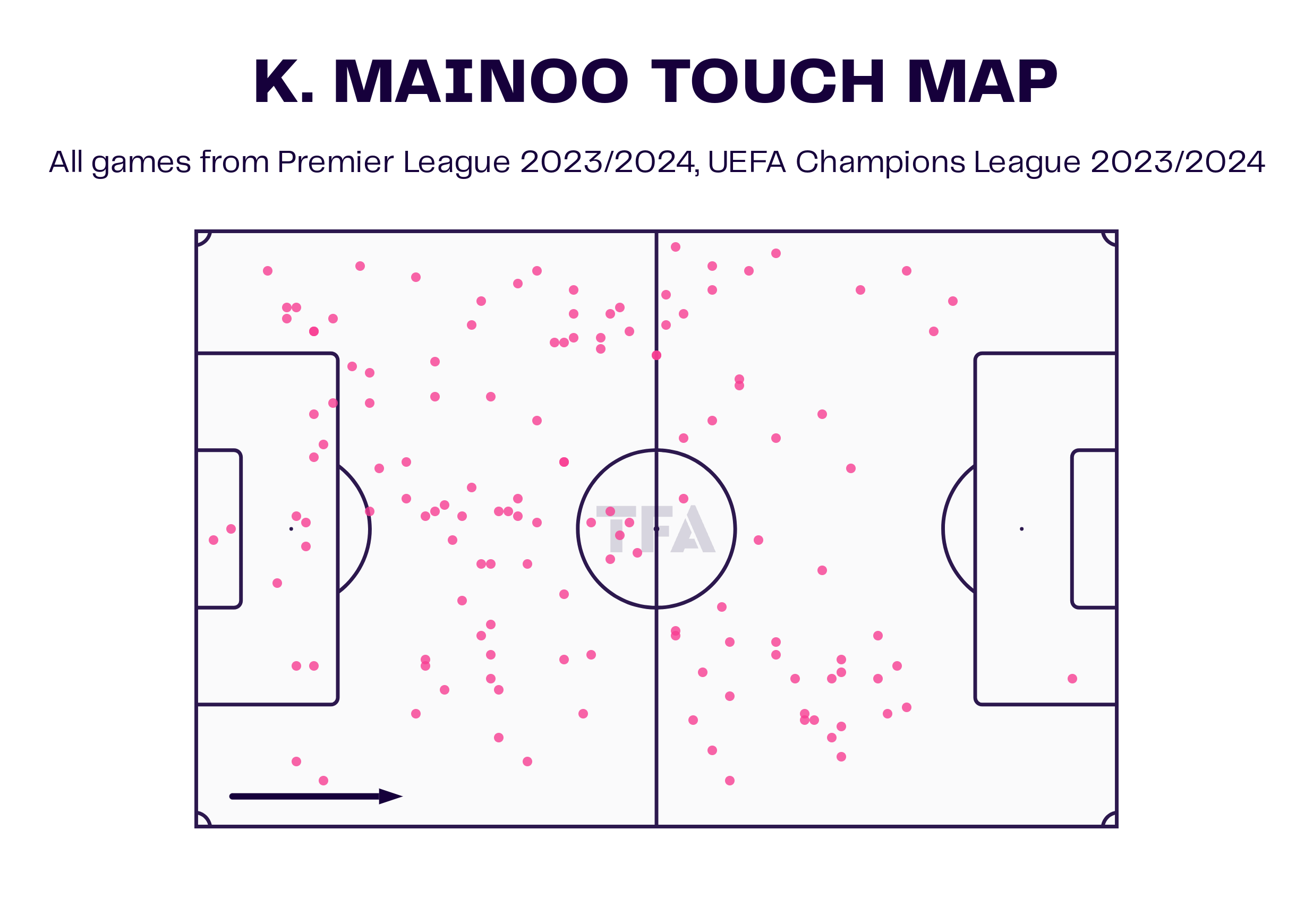Kobbie Mainoo plays as a defensive midfielder and acts as a protective shield in front of the last line of defence. His touch map in the current season shows that the player is not just sitting in front of the defence, but he is more of a runner and likes to cover a lot of areas on the field. In his first match of the season against Everton, Mainoo was making challenges everywhere and winning the ball for his team.