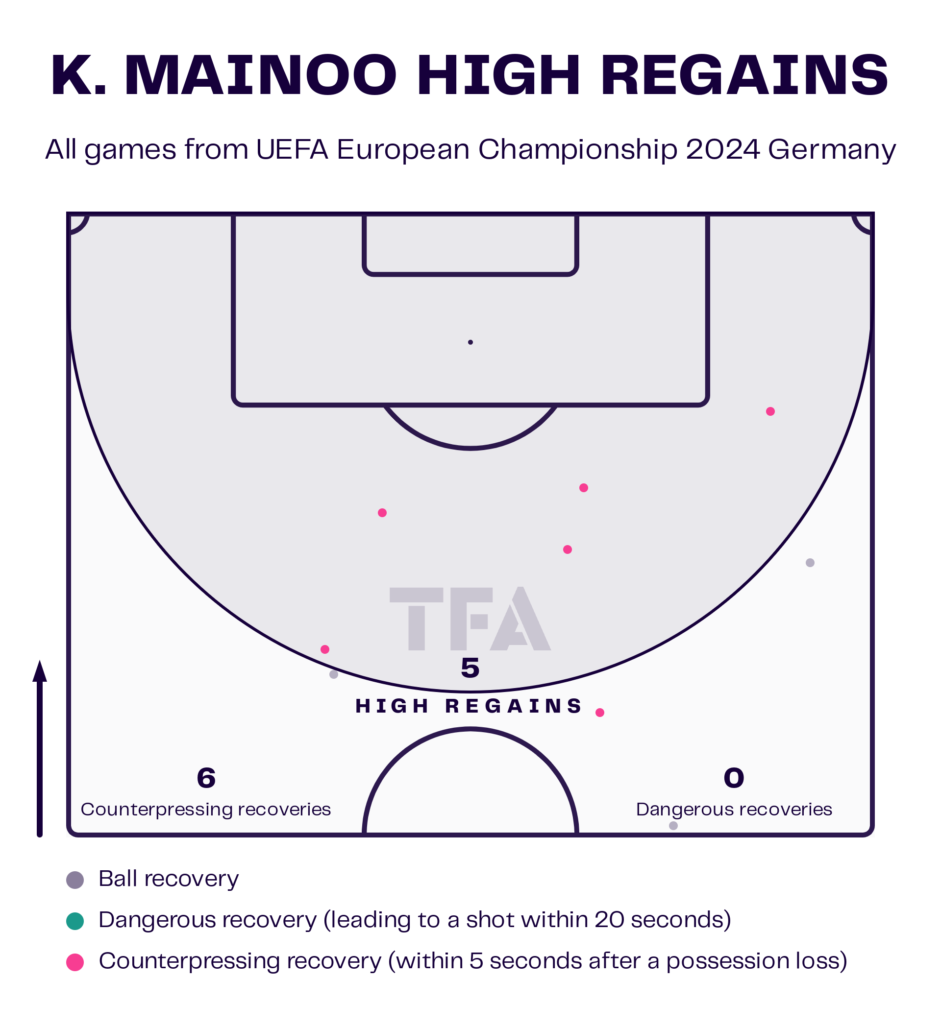 Playing up high on the field has allowed the 19-year-old to make some recoveries in the attacking half. All these came in the form of counter-pressing recoveries.