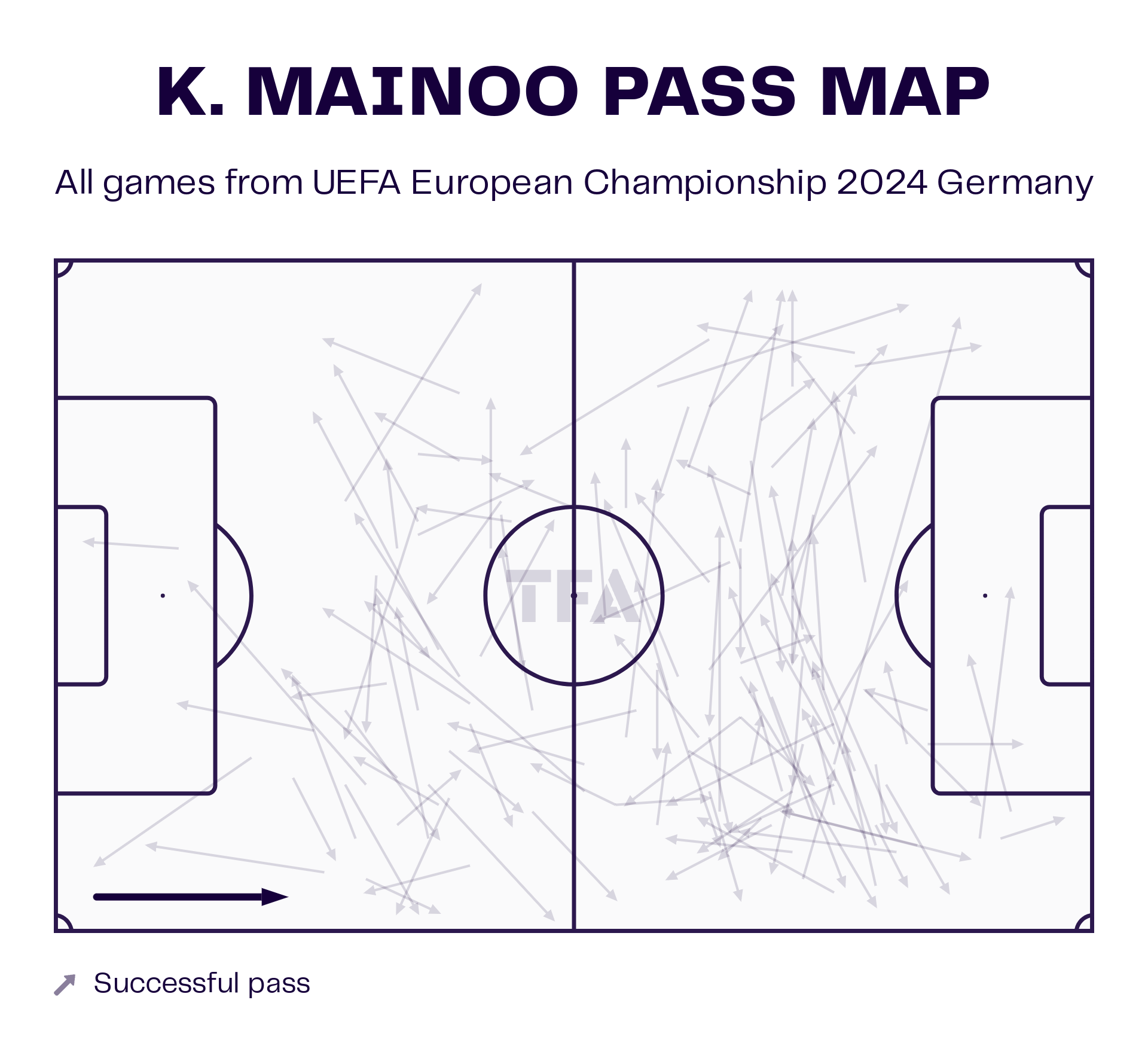 Kobbie plays as the right central midfielder for the Three Lions. His touch map shows that the player stretches the opposition and finds his way into the opposition penalty box.