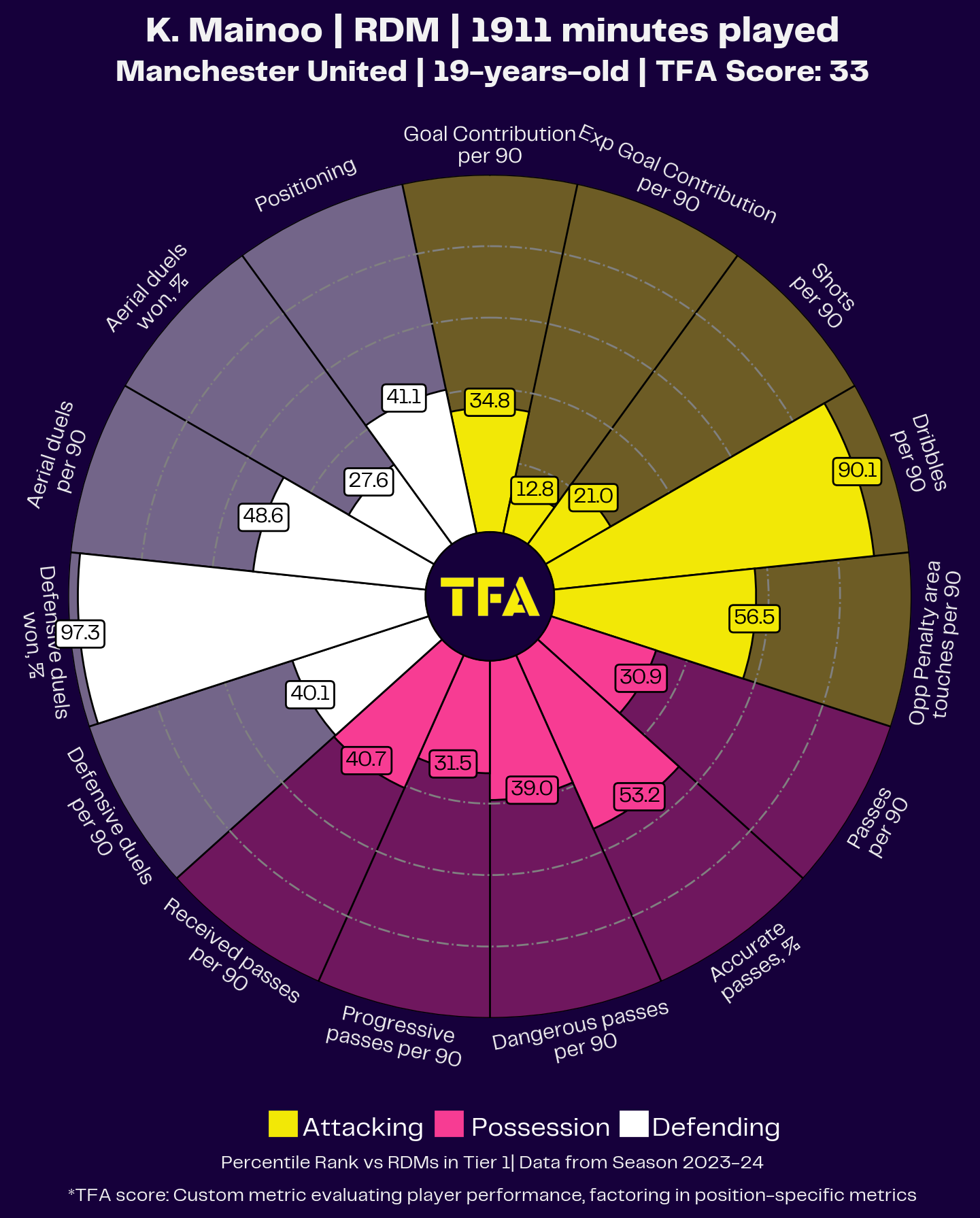 Erik ten Hag dealt with a lot of injury issues last season. This opened the door for this youngster. Mainoo took full use of the opportunity that was provided and ended the season with 24 league appearances. The above pizza chart shows the percentile rank in comparison to other right defensive midfielder in Tier 1 of league football. Mainoo was ranked highly for his dribbling abilities and contributions to the defence. He has a good percentile rank in this department.