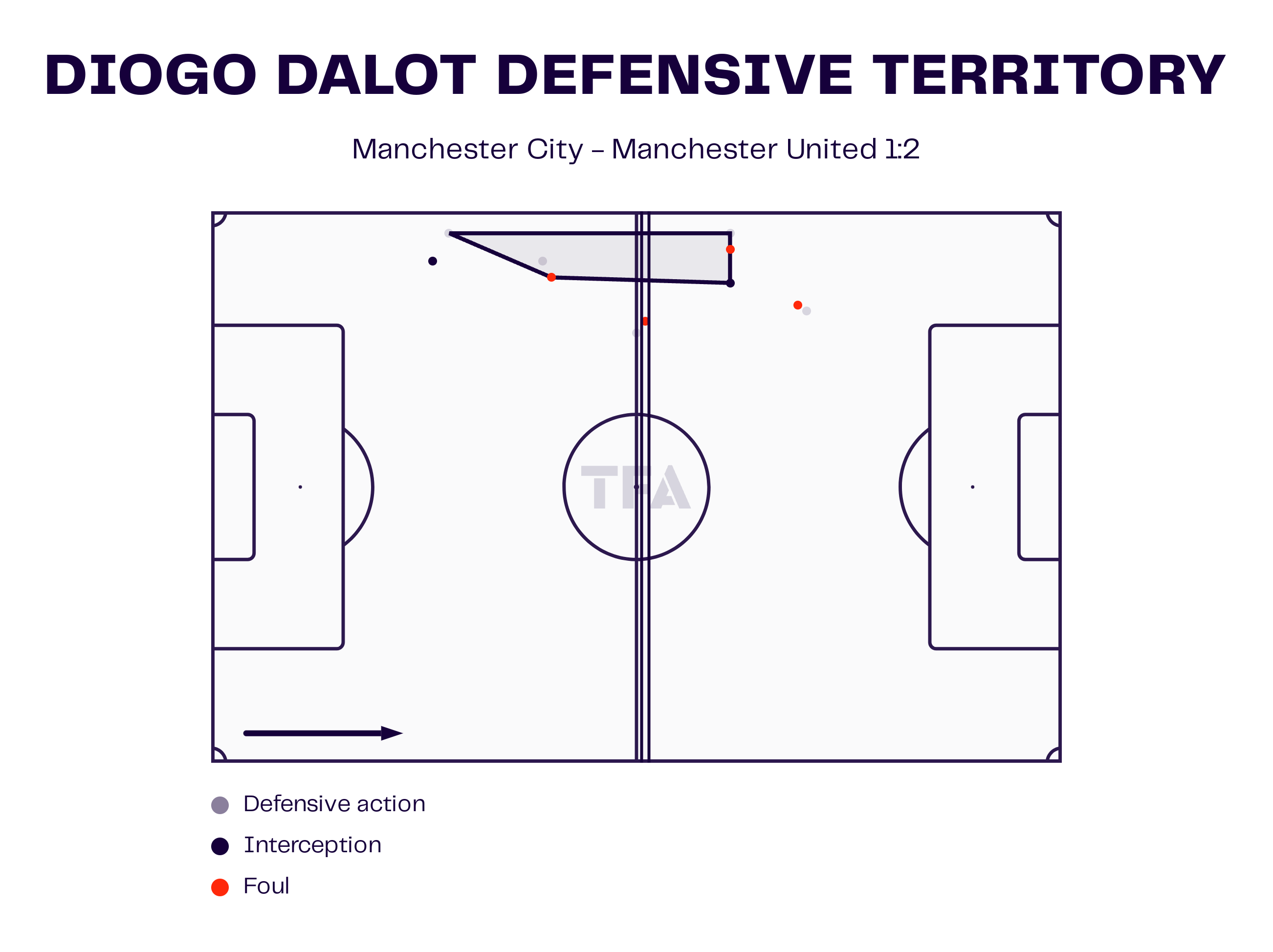 The commentary highlights Dalot’s defensive contributions, particularly his aerial prowess. In the early stages of the game, he effectively dealt with a dangerous cross from Kevin De Bruyne, with the commentator noting, “Dalot’s cross to confront him is Walker, and Ederson backs it down and collects. Well played, Dalot.” This incident showcases his anticipation, positioning, and ability to win aerial duels, crucial attributes for a modern full-back.