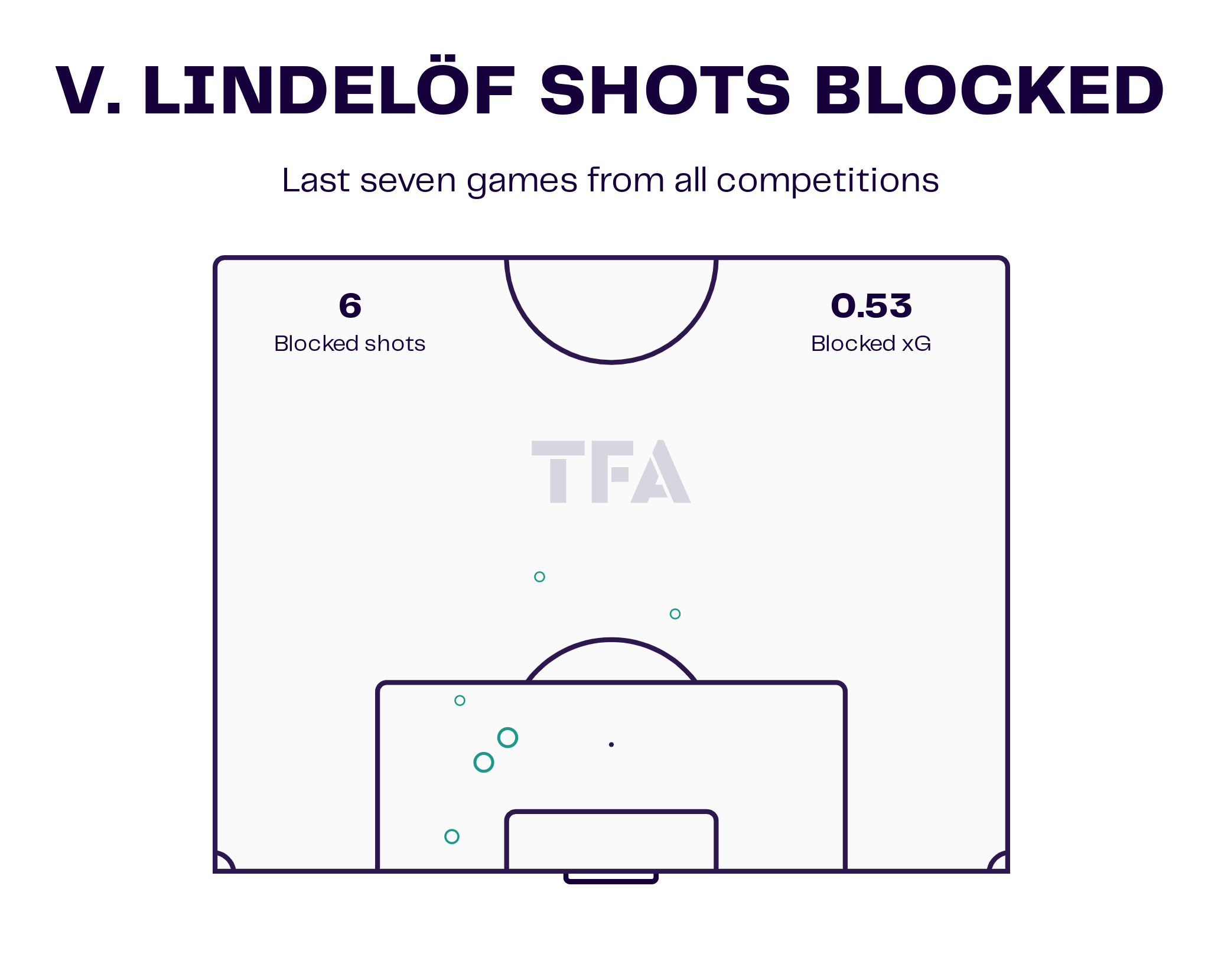 In the last seven matches combined in the English Premier League and the FA Cup, Lindelof has covered plenty of areas to stop the opposition from scoring a goal. He has won 55% of his defensive duels and 51% of his aerial duels. Along with this, Lindelof makes 4.7 interceptions per 90 minutes. He made 13 interceptions against Liverpool.
